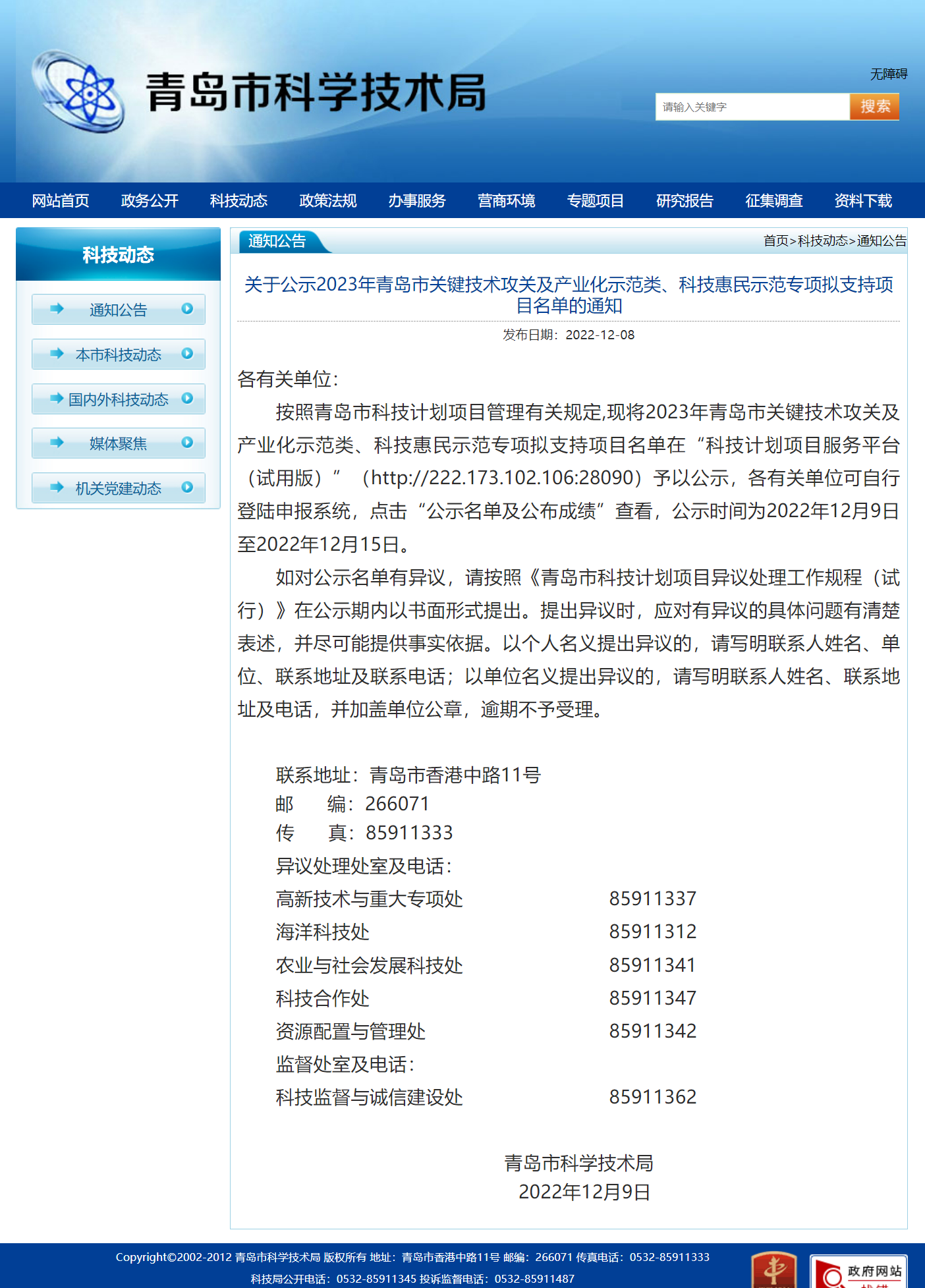 2022年12月9日,青島市科技局公布《關(guān)于公示2023年青島市關(guān)鍵技術(shù)攻關(guān)及產(chǎn)業(yè)化示范類、科技惠民示范專項(xiàng)擬支持項(xiàng)目名單的通知》,將2023年青島市關(guān)鍵技術(shù)攻關(guān)及產(chǎn)業(yè)化示范類、科技惠民示范專項(xiàng)擬支持項(xiàng)目名單予以公示。