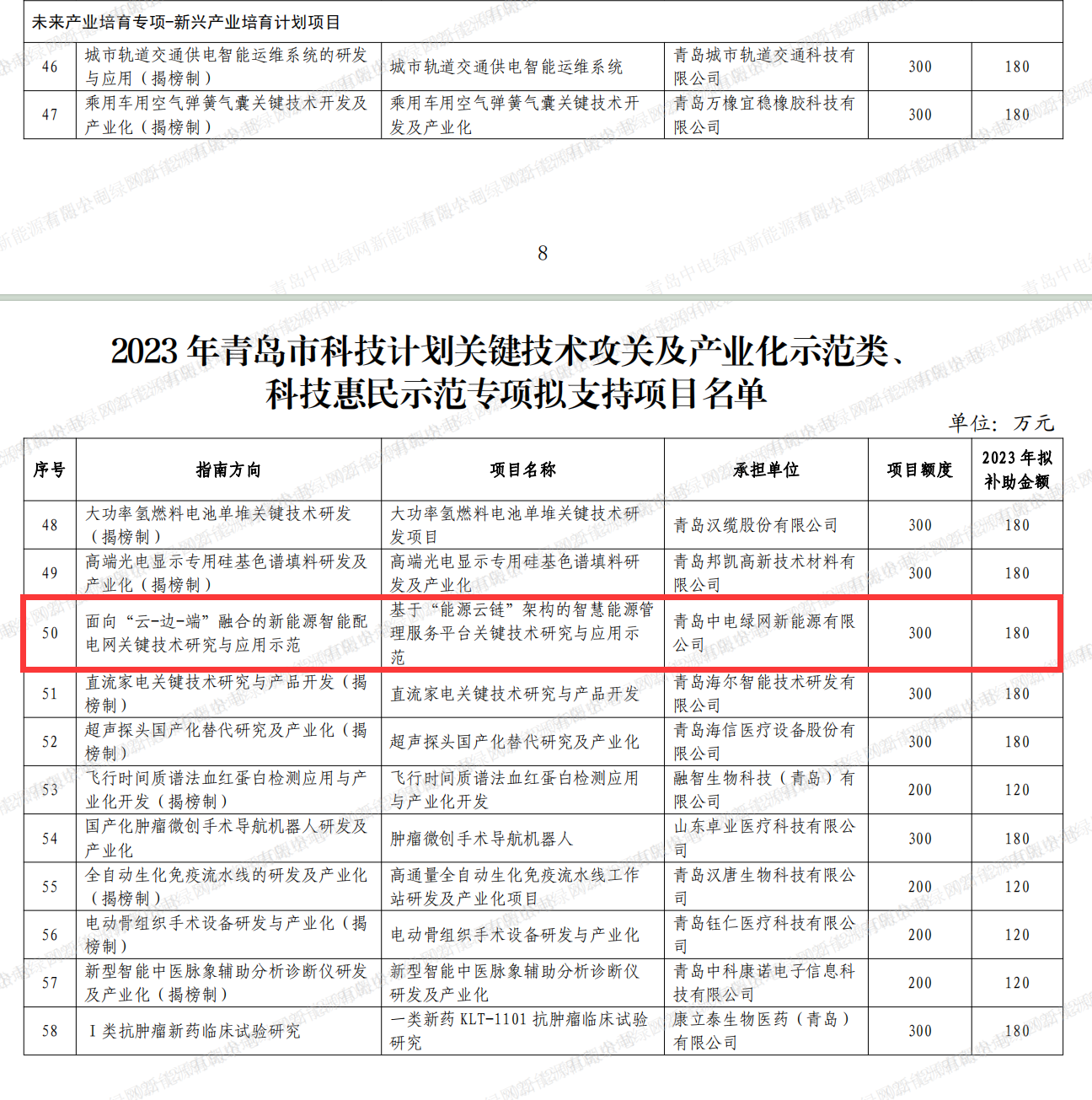 經(jīng)過(guò)專家答辯、評(píng)選及政府、專家現(xiàn)場(chǎng)考察,青島中電綠網(wǎng)新能源有限公司已成功入選青島市“2023年青島市關(guān)鍵技術(shù)攻關(guān)及產(chǎn)業(yè)化示范類-未來(lái)產(chǎn)業(yè)培育專項(xiàng)-新興產(chǎn)業(yè)培育計(jì)劃項(xiàng)目”擬支持項(xiàng)目承擔(dān)單位, 政府資助資金300萬(wàn)。